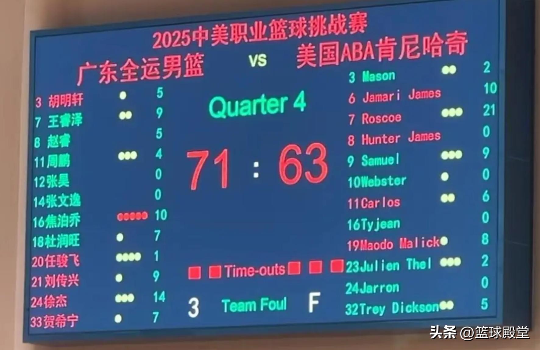 广东全运男篮以71比63击败美国ABA肯尼哈奇男篮。这是双方进行的第二场比赛,这场比赛广东上半场就完成了吊打,无奈下半场一直都在调整阵容,外加防守不行,进攻端也打不开,最终造成他们被对手持续追分,分差没有上场比赛那么完美。