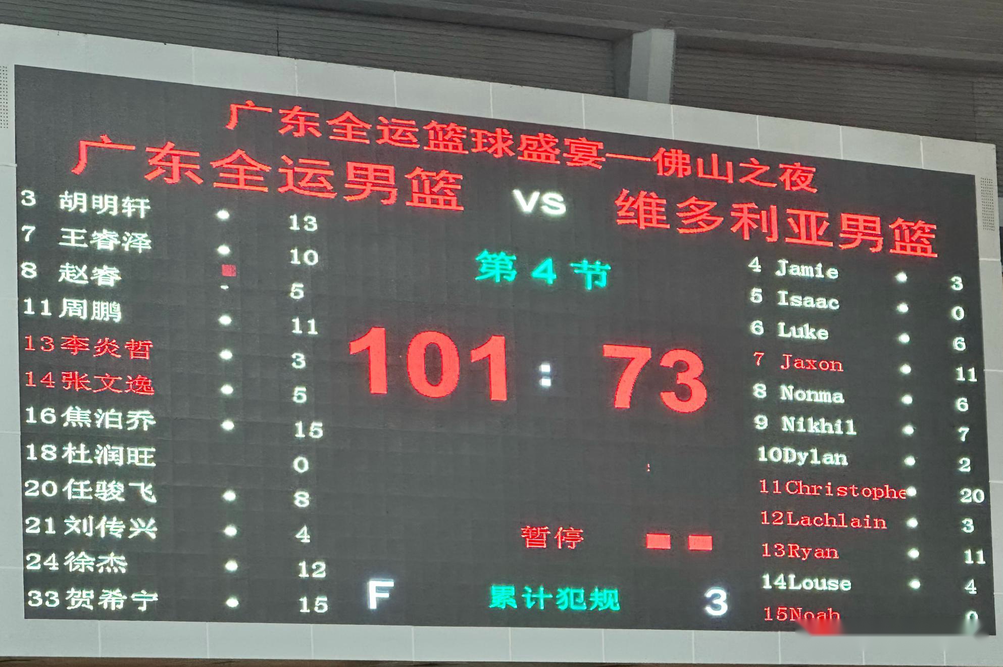 广东全运男篮以101比73战胜了实力一般的澳洲维多利亚男篮。这场比赛广东就是全场比赛压制,打得没有任何悬念。这种趋势下,广东还有六个人得分上双。