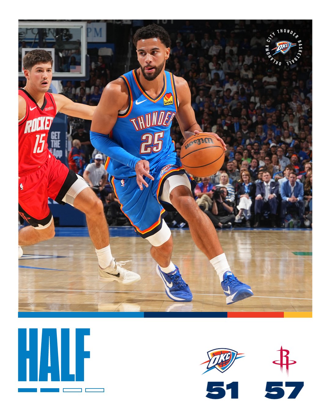 开场后,切特·霍姆格伦前5次出手全部命中,一人连砍13分,带领雷霆取得15-14开局。阿门·汤普森和杜兰特联手打出一波7-2小高潮,火箭以21-17反超。这波攻势并未给卫冕冠军带来困扰,亚历山大完成精准跳投,维金斯也飙中三分,雷霆瞬间夺回领先优势。然而,在该节最后1分40秒时间内,雷霆一分未得。火箭则依靠谢泼德和卡佩拉在首节结束时以30-27领先雷霆。次节,两队进入疯狂对轰模式,火箭连续飙中4记三分,将比分改写成46-42。米切尔的三分无法减缓火箭升空的速度,杜兰特登场后连中3球,申京也在外线建功,火箭将优势扩大到10分。但米切尔的压哨3+1帮助雷霆在上半场结束时追至51-57。