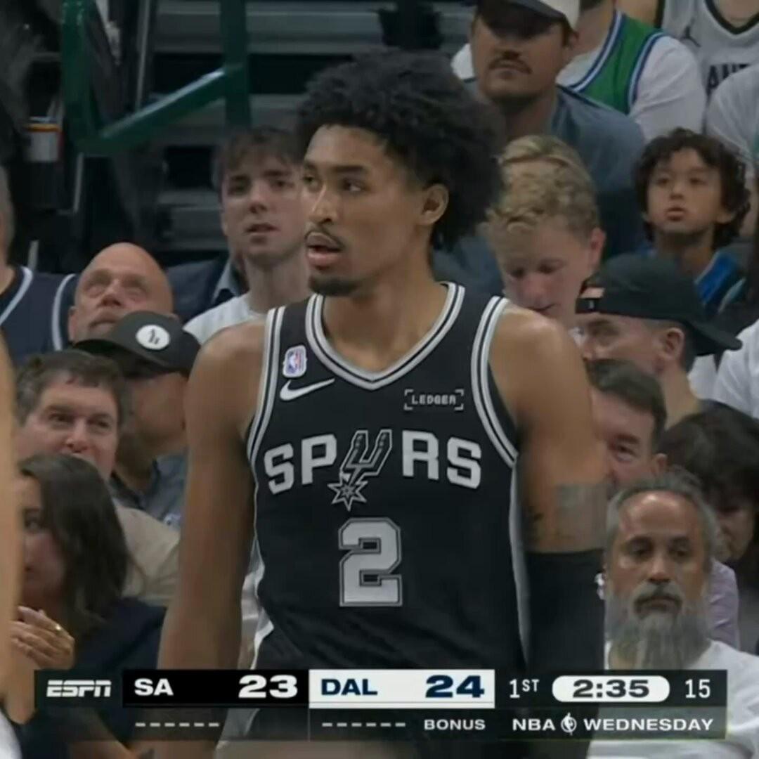 本场比赛,马刺队在今年选中的榜眼秀迪伦-哈珀迎来了自己职业生涯的常规赛首秀,全场比赛他替补出场22分41秒,14投7中得到15分4篮板2助攻,三分球2中1,罚球2中0,出现了4次失误5次犯规,正负值+5。