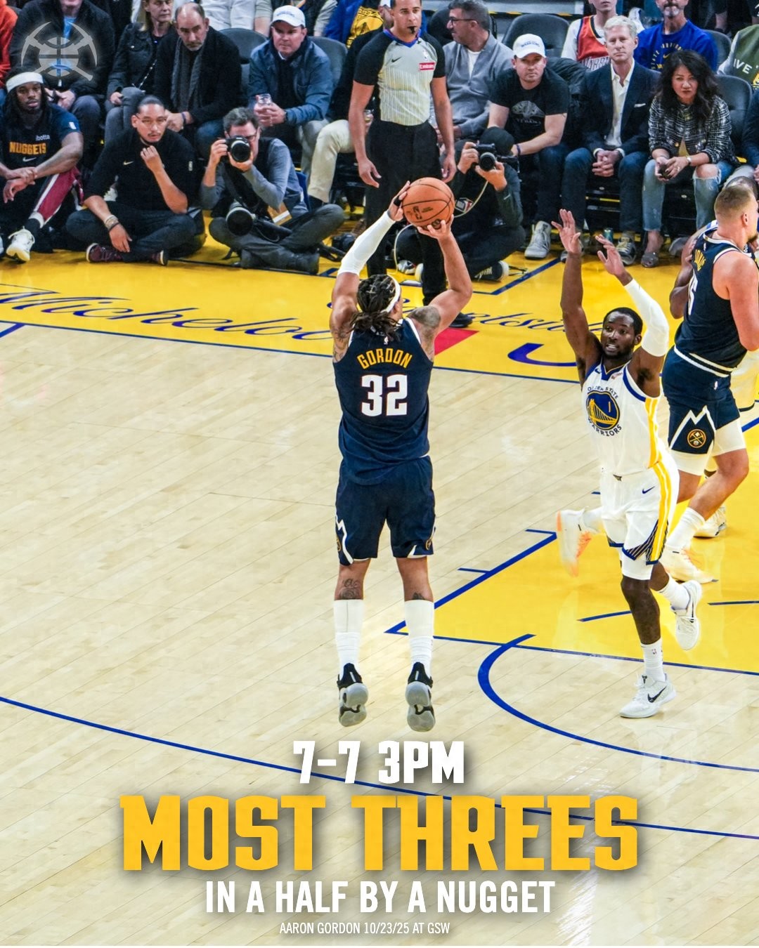 库里、波杰姆斯基上来进三分,勇士10-0开局。约基奇连续篮下得手,掘金回敬一波12-0反超比分。阿隆-戈登在最后5分钟爆发,个人命中3记三分独得11分,掘金首节31-27领先。第二节瓦兰丘纳斯统治篮下。但波杰姆斯基、希尔德连续回应,追梦、霍福德又命中三分,勇士追到只有1分分差。约基奇远投止血。戈登再次外线爆发,连中4记三分,上半场三分球7投7中得到25分。掘金最多领先14分,半场70-61领先结束。