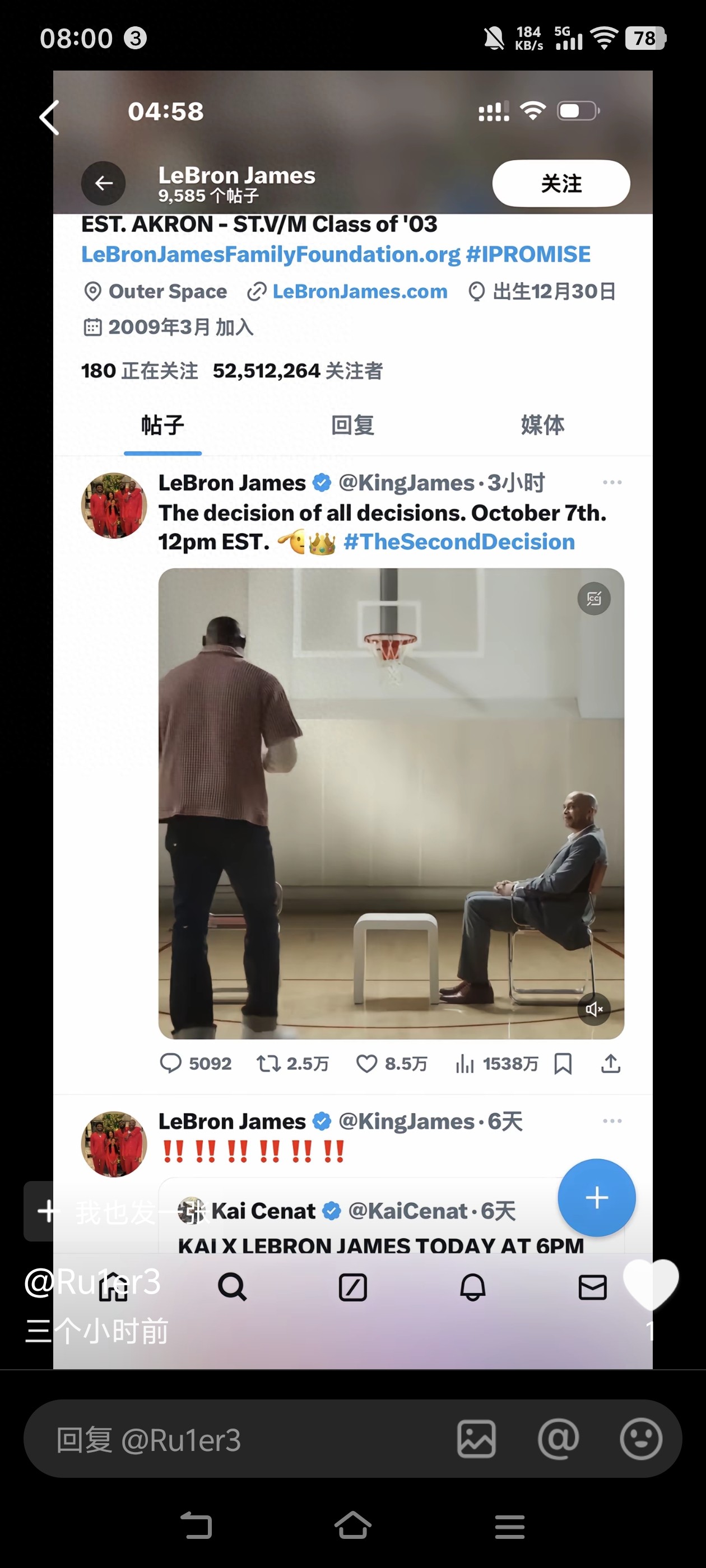 勒布朗-詹姆斯此前突然更新社媒写道:“所有决定中的决定,10月7日,美东中午12点。”