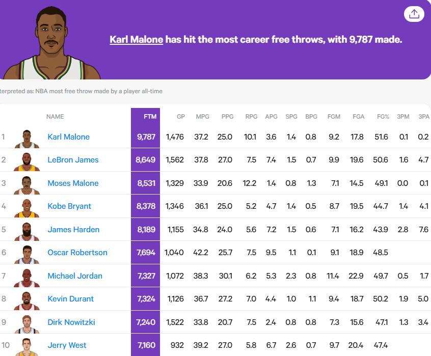 目前排在杜兰特身前的是奥斯卡-罗伯特森,他距离罗伯特森还有366个罚球命中数的差距。