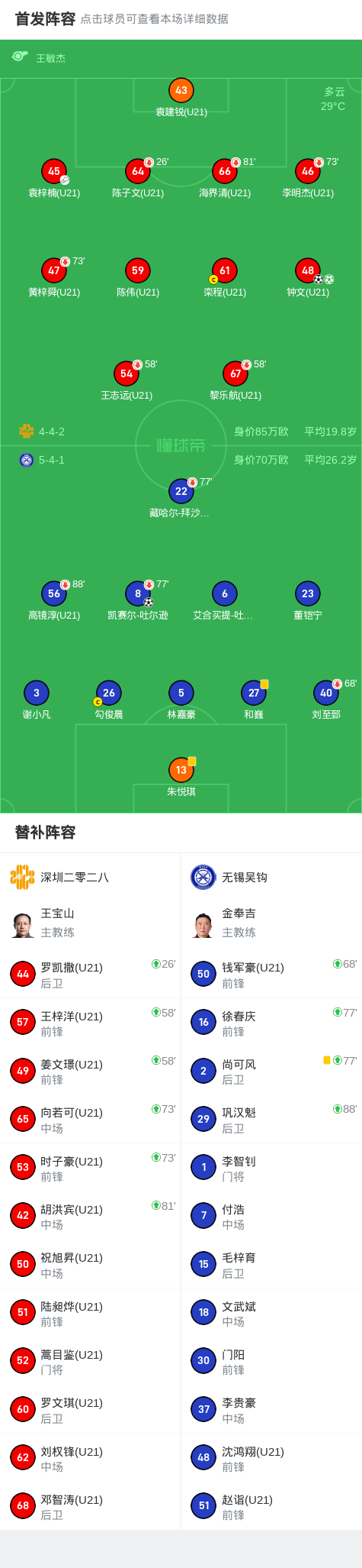 北京时间10月5日中国足球乙级联赛 决赛阶段争冠组 第28轮,深圳二零二八主场对阵无锡吴钩。深圳二零二八钟文梅开二度。无锡吴钩凯赛尔-吐尔逊破门。最终比分深圳二零二八 2 - 1 无锡吴钩。