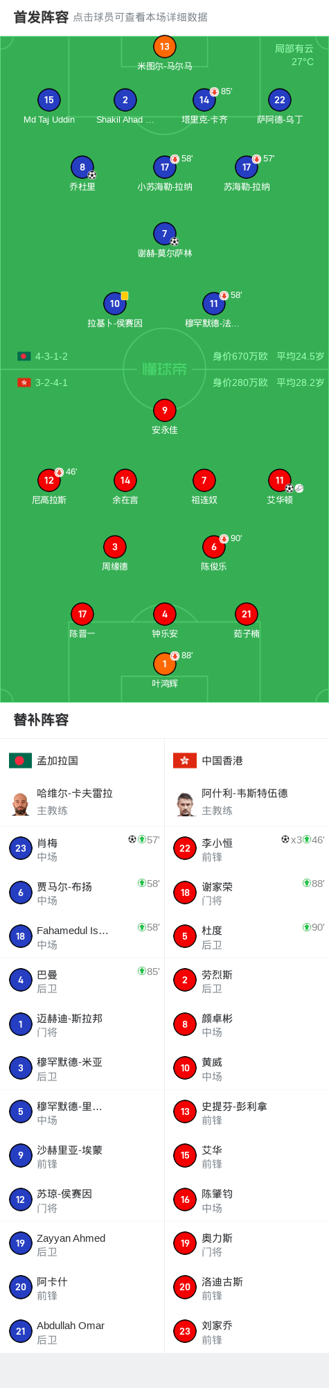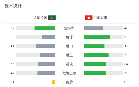 北京时间10月9日亚洲杯 预选赛小组赛 第3轮,孟加拉国对阵中国香港。孟加拉国乔杜里破门,谢赫-莫尔萨林破门,肖梅破门。中国香港艾华顿破门,李小恒帽子戏法。最终比分孟加拉国 3-4 中国香港。