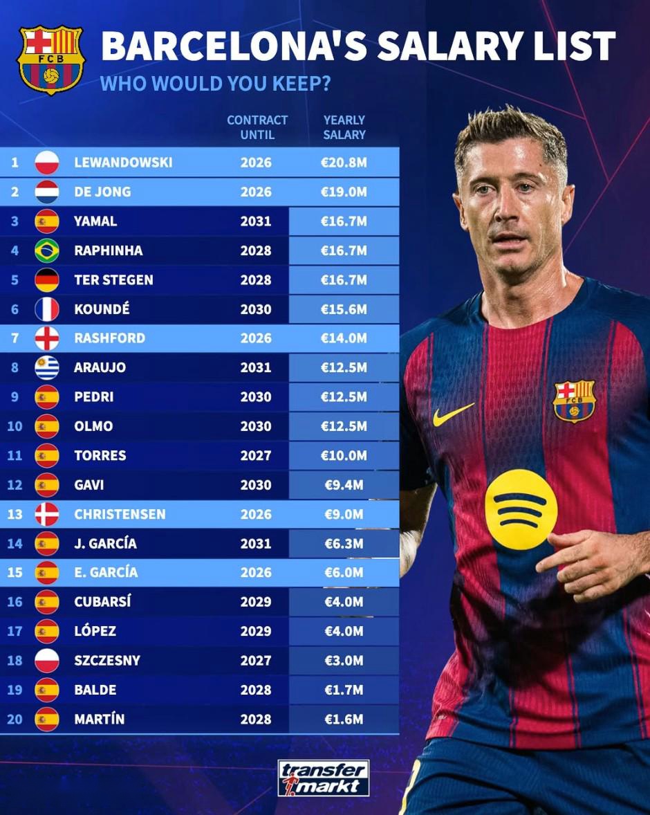 德转列巴萨队内年薪:莱万超2000万欧第1,亚马尔1670万第3