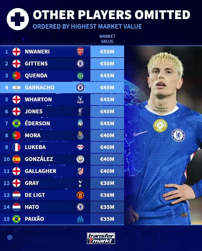 扎伊尔-埃梅里(法国/巴黎圣日耳曼)5000万欧元、梅努(英格兰/曼联)5000万欧元、贝林厄姆(英格兰/皇家马德里)1.8亿欧元