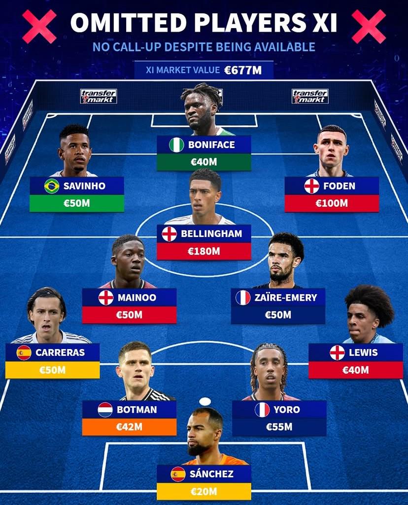 德转列此次非伤病原因落选国家队的最贵11人阵容:
