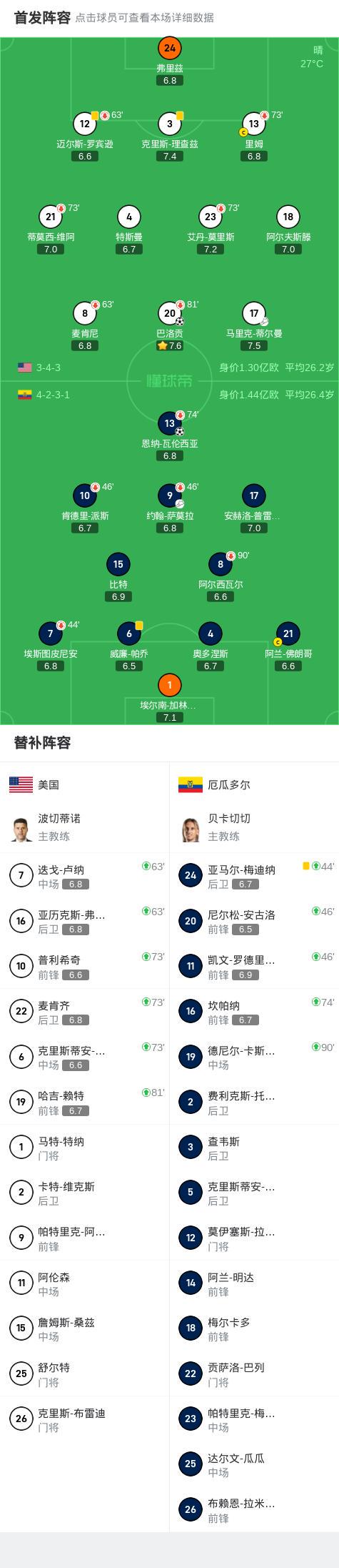 美国1-1厄瓜多尔,恩纳-瓦伦西亚破门,巴洛贡扳平