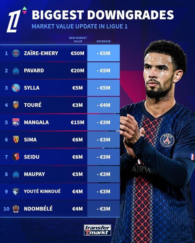 10月,德国转会市场更新了法甲联赛的球员身价,德转统计了法甲球员身价下跌榜,其中埃梅里、帕瓦尔、阿巴卡尔-西拉均下跌500万欧