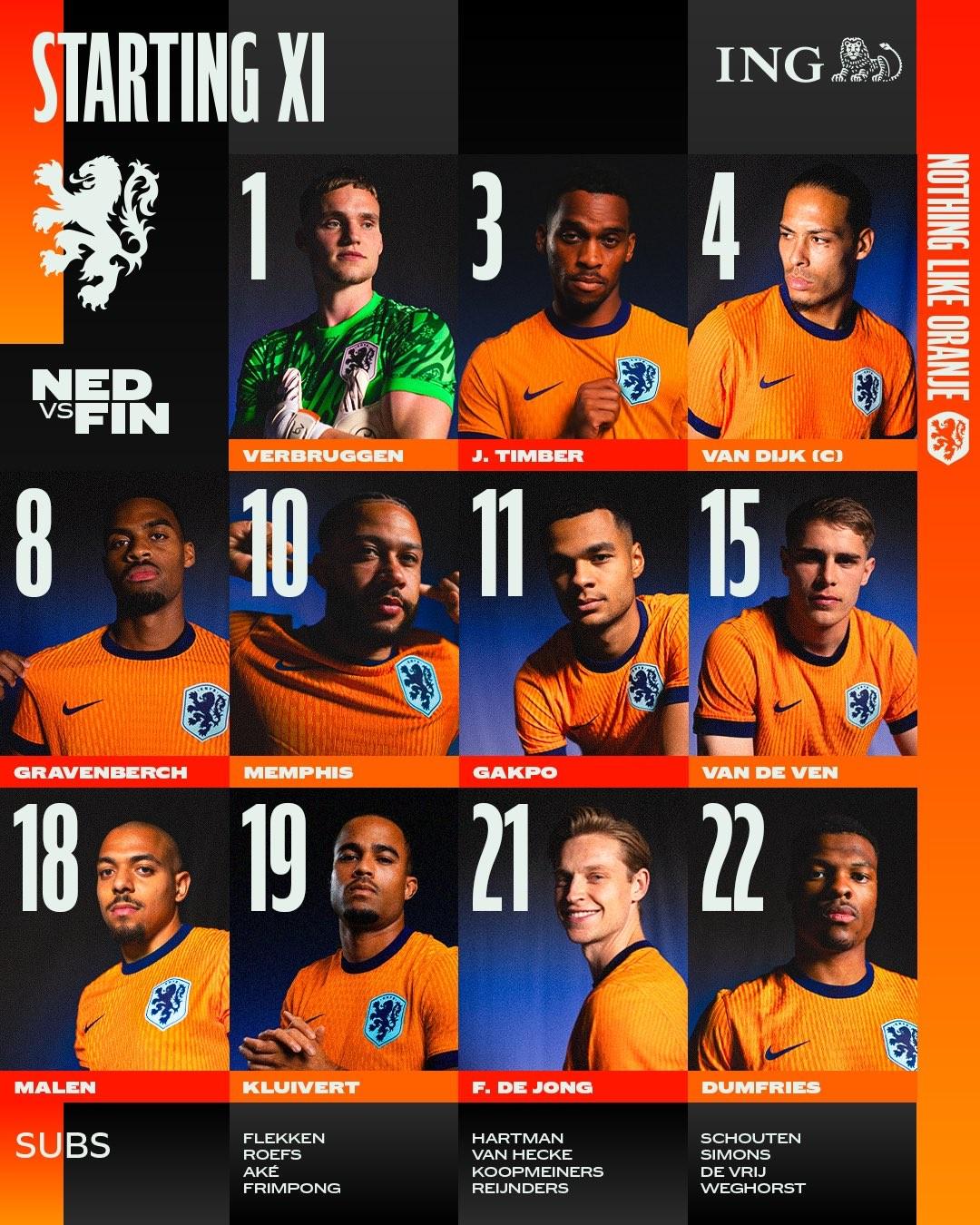 荷兰首发: 1-巴尔特-费布鲁亨、15-范德芬、3-廷贝尔、4-范戴克、22-邓弗里斯、21-弗朗基-德容、8-赫拉芬贝赫、10-德佩、11-加克波、18-马伦、19-尤斯廷-克鲁伊维特
