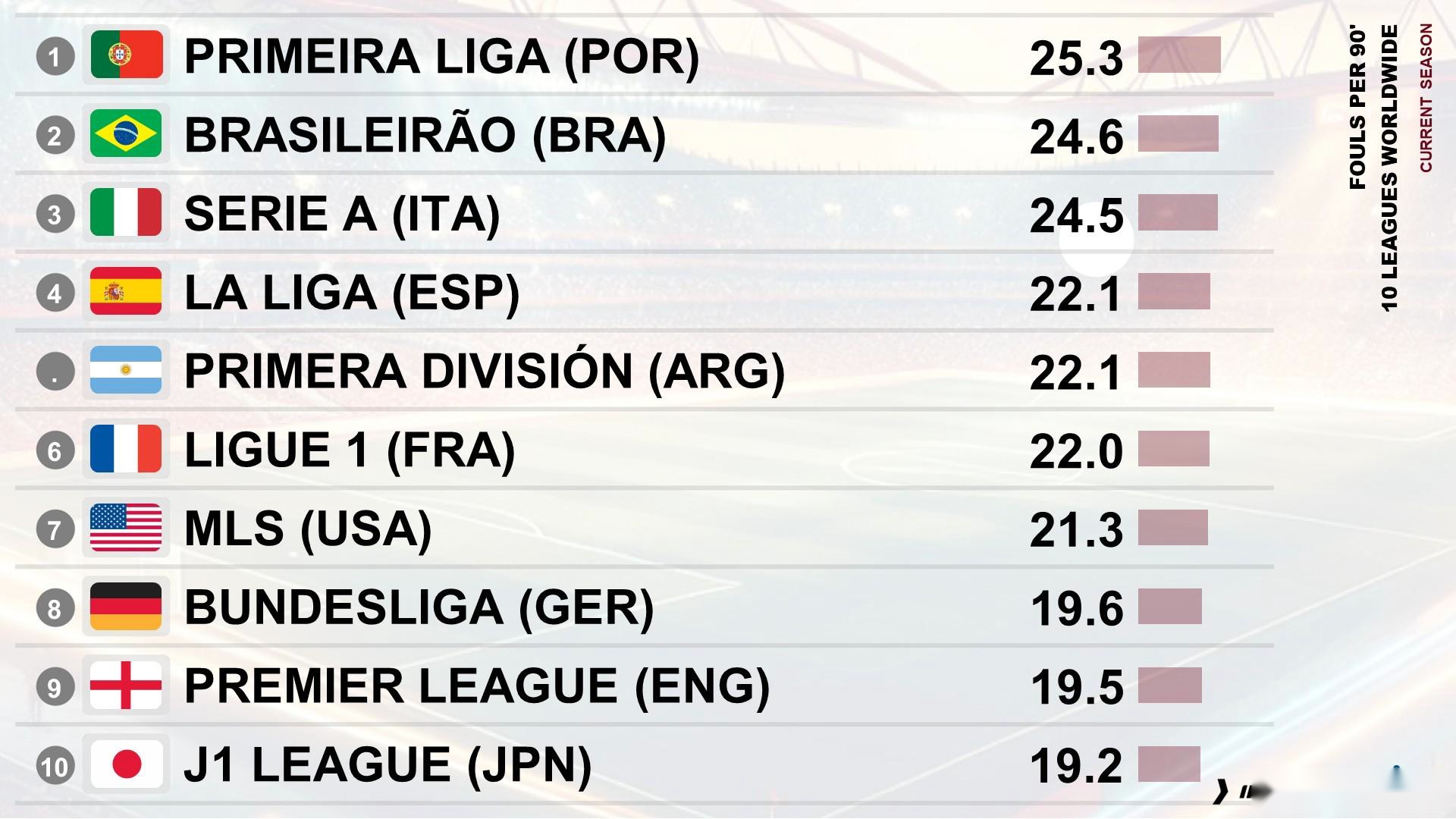 各联赛每90分钟犯规次数榜:葡超25.3次居首、意甲24.5次第三