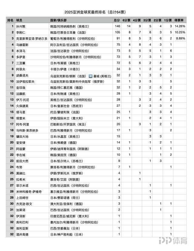 《体坛周报》公布2025亚洲金球奖投票结果,孙兴慜146分第10次夺魁,李刚仁105分排名第二,C罗91分排名第三。