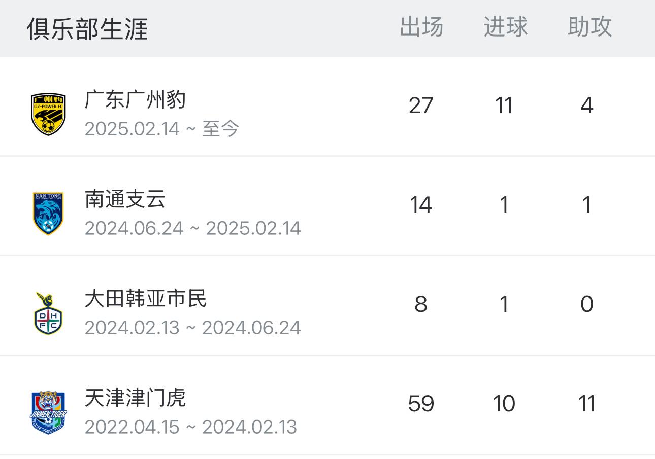 2025赛季至今,罗萨已经代表广东广州豹出场27次,斩获11粒进球和4次助攻。