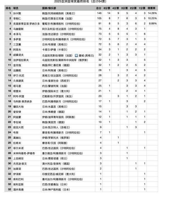 《体坛周报》方面表示,历时近两个月的筹备、投票、统计工作结束后,《体坛周报》亚洲金球奖评选在2025年10月初圆满结束,42位代表42个亚足联会员国/地区的评委,以及22位特邀国际评委参与了投票。韩国国家队及前托特纳姆热刺队长孙兴慜以146分名列第一,获得了2025年亚洲金球奖。另一位韩国球星李刚仁以105分名列第二,效力于沙特利雅得胜利的葡萄牙球星C罗以91分排名第三。