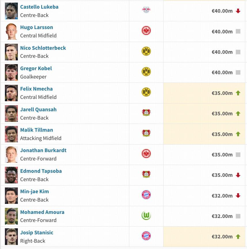 多特蒙德前锋阿德耶米身价上涨1500万欧,达到了6000万欧。法兰克福前锋乌尊身价上涨2700万欧,达到了4500万欧。拜仁小将伦纳特-卡尔身价上涨1850万欧,达到了2000万欧,成为了2008年龄段里身价最高的球员。