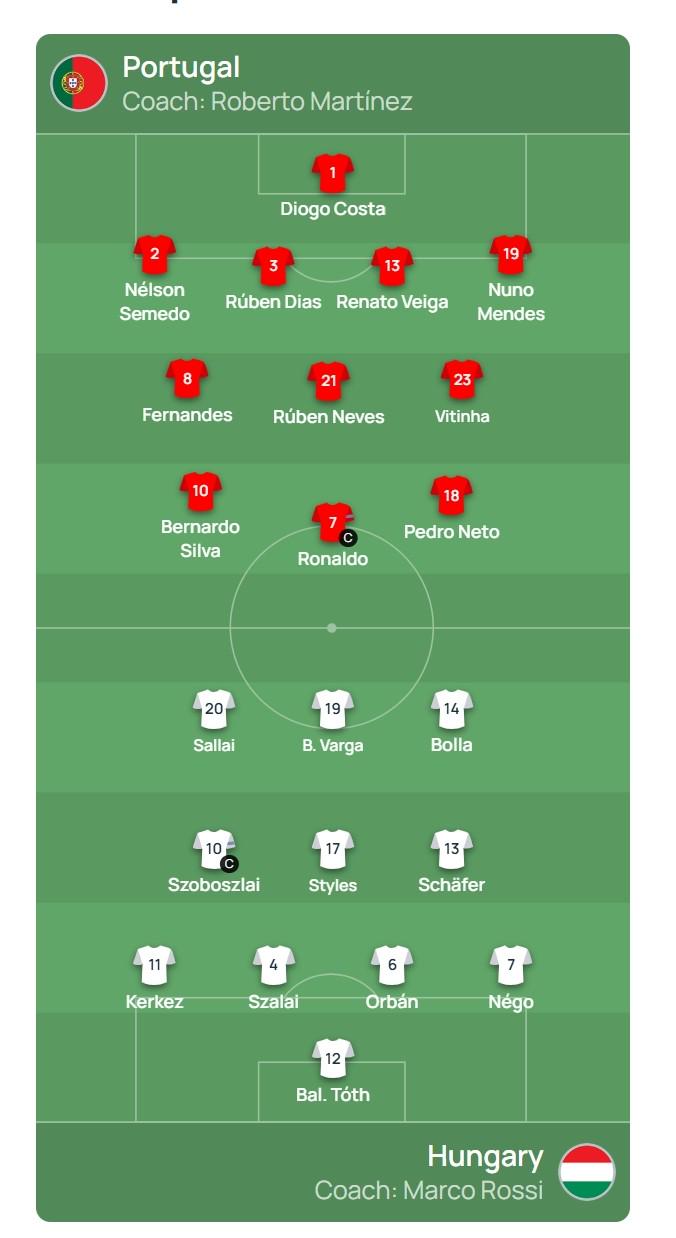 葡萄牙首发: 1-迪奥戈-科斯塔、2-塞梅多、3-鲁本-迪亚斯、13-韦加、19-努诺-门德斯、8-B费、21-鲁本-内维斯、23-维蒂尼亚、10-B席、18-佩德罗-内托、7-C罗