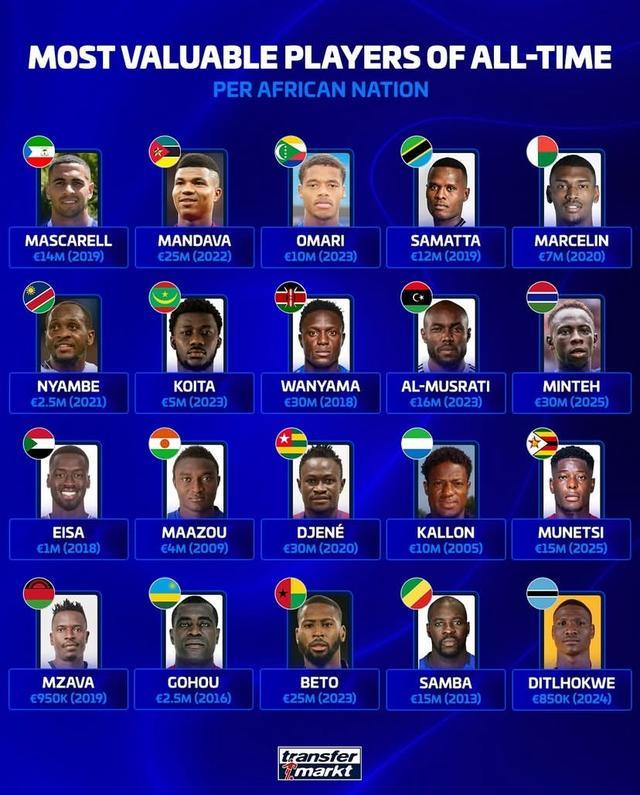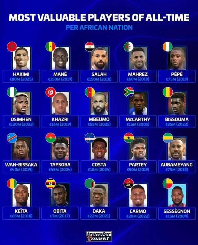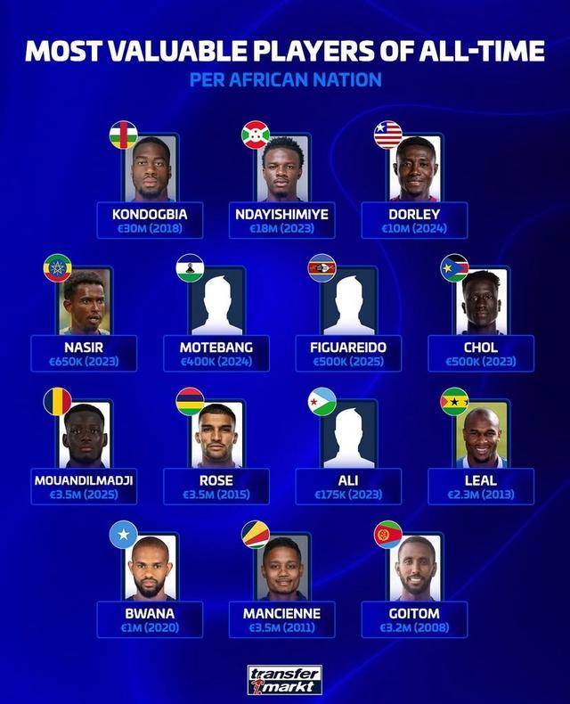 德转列非洲各国球员历史最高身价: