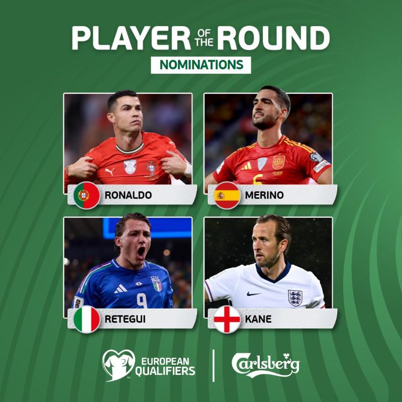 北京时间10月15日,世预赛欧洲区第一阶段小组赛第9轮的比赛全部结束,欧足联官方也选出了本轮最佳球员的四位候选者,分别梅开二度的C罗、梅里诺、雷特吉以及哈里-凯恩入围。