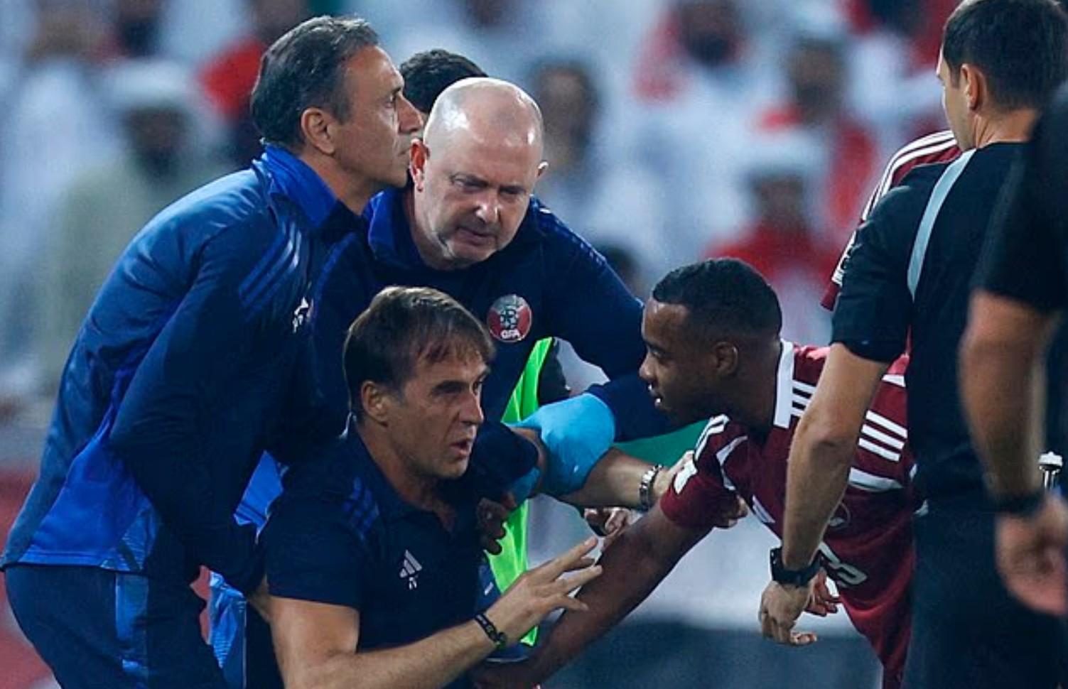 比赛中,卡塔尔主帅洛佩特吉被皮球一脚闷中面部后倒地,之后在洛佩特吉起身后,他的右眼眶附近全部变红肿,明显这一球的力道十足。