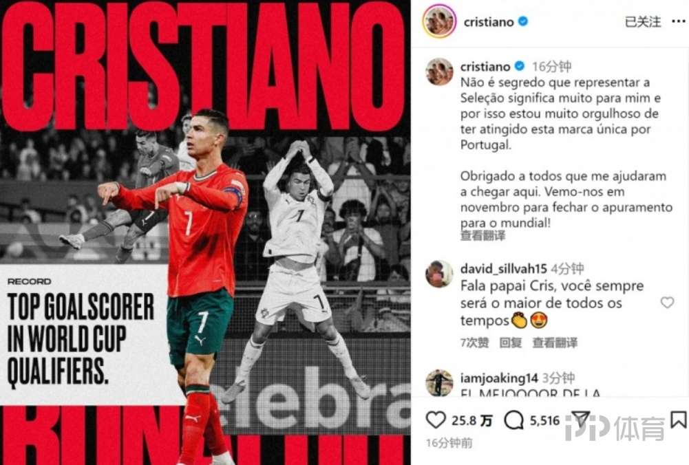 C罗社媒晒出海报庆祝,配文:“众所周知,代表国家队出战对我来说意义重大,因此能为葡萄牙达成这一独特里程碑,我深感自豪。”