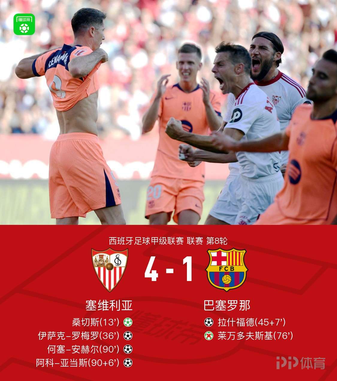 北京时间10月5日西班牙足球甲级联赛 联赛 第8轮,塞维利亚主场对阵巴塞罗那。塞维利亚桑切斯破门,伊萨克-罗梅罗破门,何塞-安赫尔破门,阿科-亚当斯破门。巴塞罗那拉什福德破门。最终比分塞维利亚 4-1 巴萨。