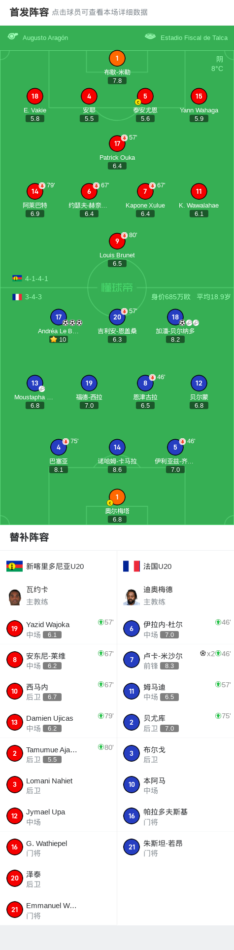 北京时间10月6日U20世界杯 小组赛 第3轮,新喀里多尼亚U20对阵法国U20。法国U20Andréa Le Borgne帽子戏法,卢卡-米沙尔梅开二度,加潘-贝尔纳多破门。最终比分新喀里多尼亚U20 0-6 法国U20。