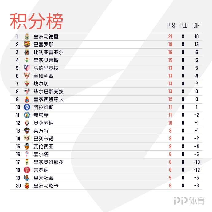 西甲积分榜:皇马2分领跑 巴萨惨败第2马竞落后榜首8分