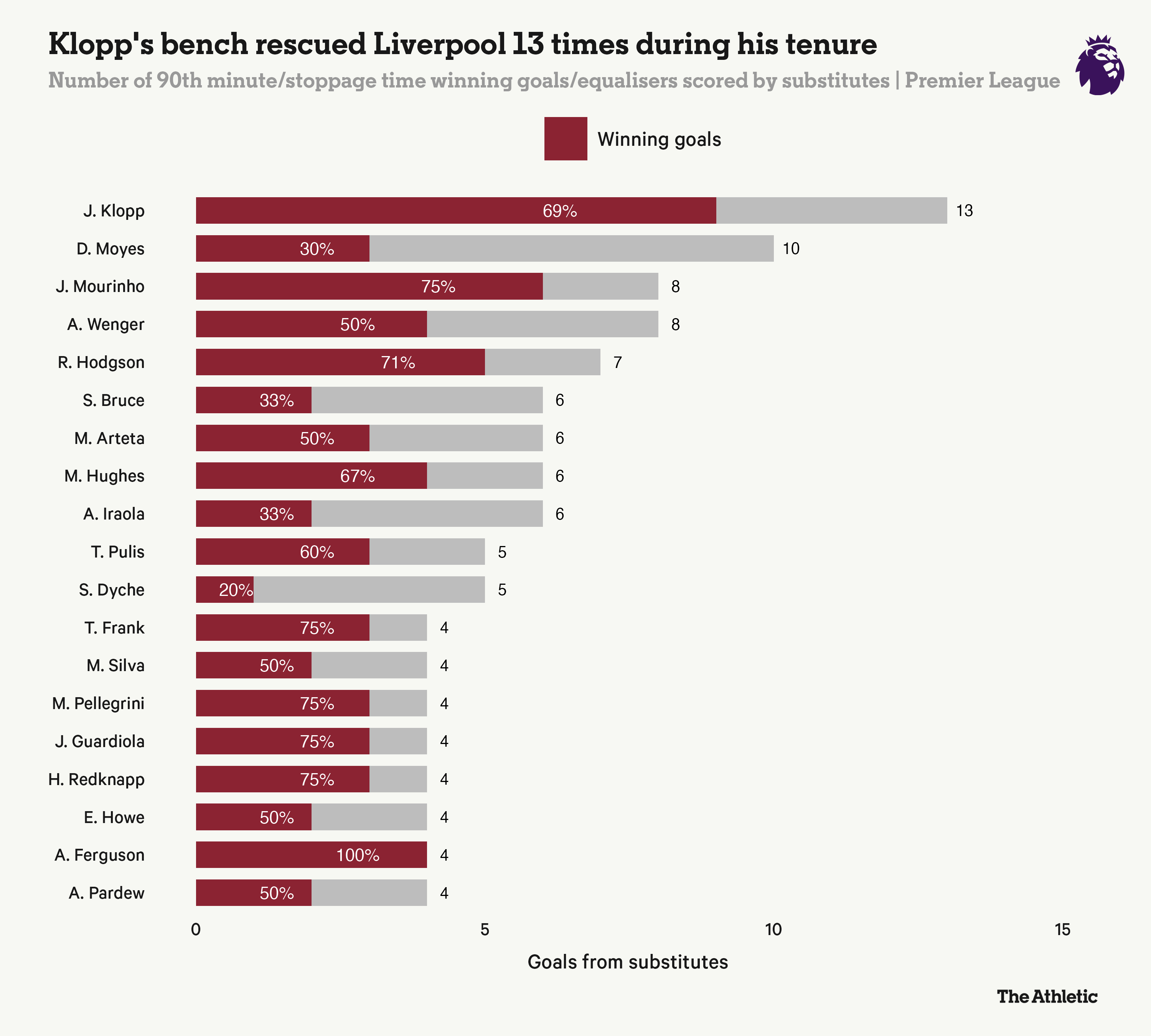 其他英超历史教练中,克洛普在后期换人调整方面遥遥领先,他的替补球员共打入了13个决定性进球。弗格森仅有四次类似的关键时刻,但每一次都令人难忘。这些进球全部都是制胜球:弗兰对阵切尔西,奥谢在安菲尔德的进球,迈克尔-欧文在德比战中对阵曼城的戏剧性进球,以及费德里科-马凯达在对阵阿斯顿维拉时的首秀弧线破门。这些时刻深深地铭刻在英超的集体记忆中,并可能让弗格森因补时进球而获得的声誉超越了实际统计数据。
