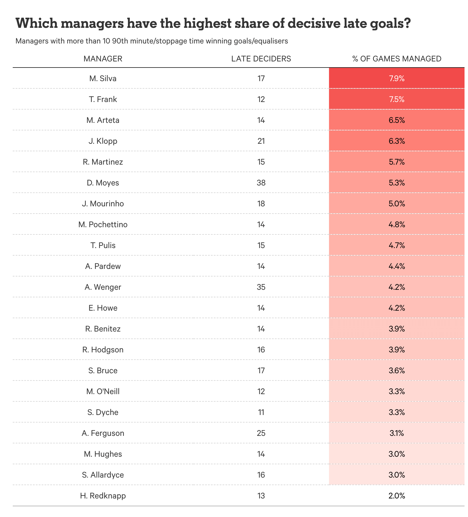 以下是所有拥有超过10个补时关键进球的教练名单。弗格森在总排名中位列第三,但这反映了他在810场英超比赛中执教的长久性;从百分比来看,他排在倒数第四。位居榜单前列的是马尔科-席尔瓦、托马斯-弗兰克和阿尔特塔三位现任英超主帅,这也进一步证明了我们确实正处于补时进球的时代。
