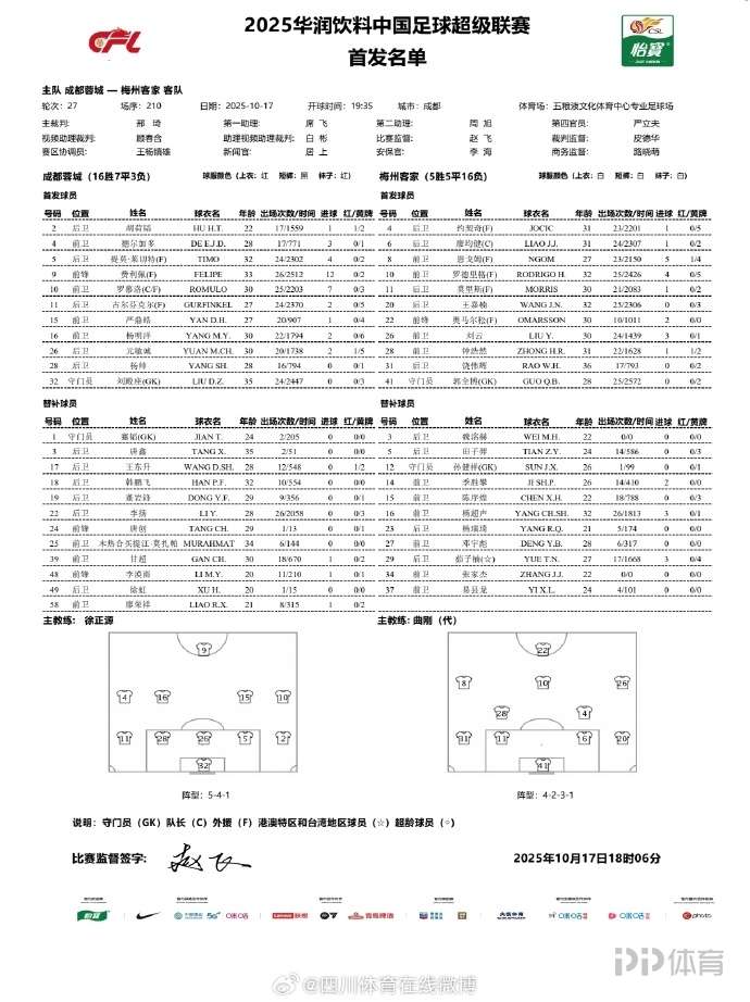 北京时间10月17日19:35,中超第27轮的一场对决。成都蓉城坐镇主场,迎战梅州客家。赛前,双方的阵容公布如下: