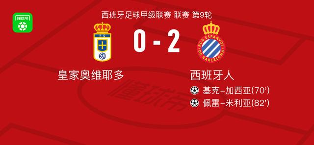 西班牙人2-0皇家奥维耶多,基克-加西亚建功,佩雷-米利亚锁定胜局