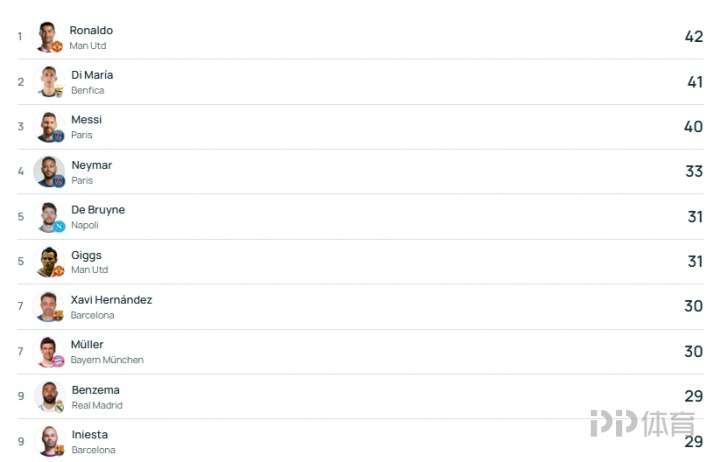 欧冠历史助攻榜:C罗居首,德布劳内升至第五为现役五大联赛唯一