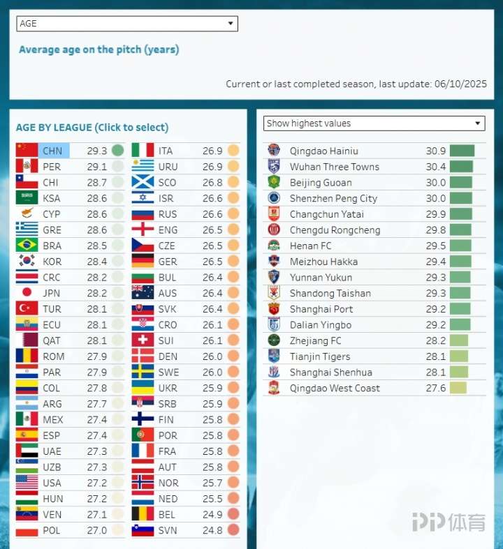 据CIES统计,在全球50个主流联赛中,中超的平均年龄为29.3岁,仍为全球最高,比第二的秘鲁联赛高出0.2岁。