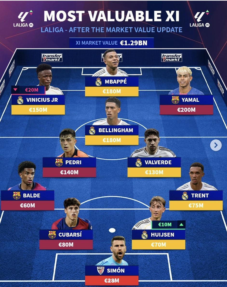 本赛季西甲最贵阵容:亚马尔2亿欧领衔,皇马入选6人,巴萨入选4人