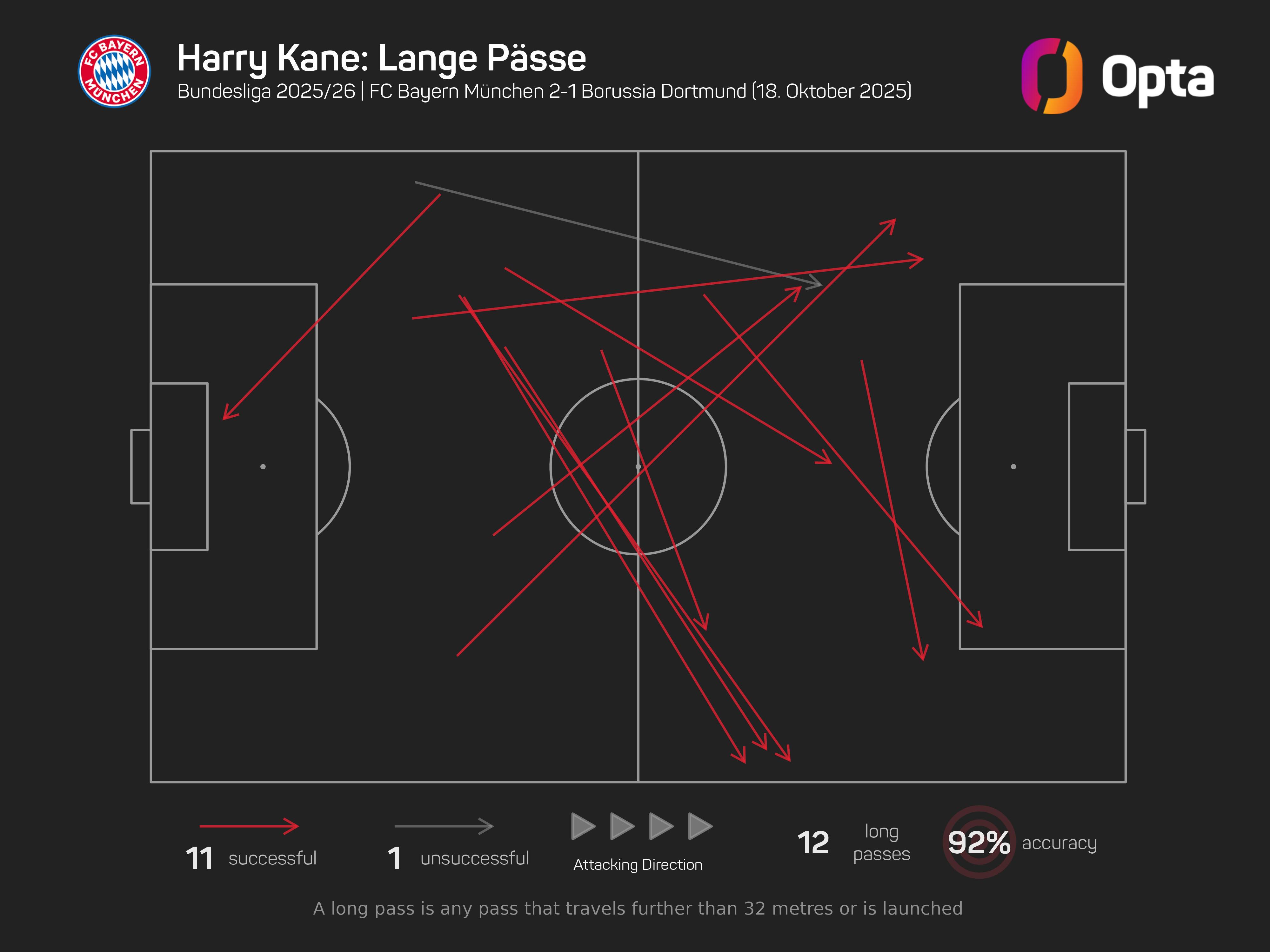 赛后,据Opta数据,凯恩在本场比赛中完成11次成功长传,这一数据创下他在欧洲五大联赛单场长传成功次数的个人新高。
