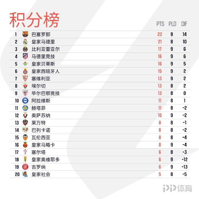 西甲第9轮,巴萨2-1绝杀赫罗纳,贝蒂斯客场2-2绝平黄潜,马竞1-0奥萨苏纳,最新积分榜如下: