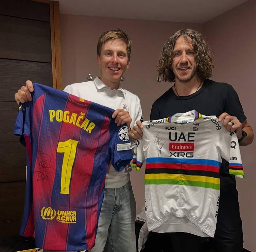 塔代伊-波加查目前在安道尔参加安道尔自行车大师赛,他与普约尔合影,手上拿着印有自己姓氏和号码1号的巴萨球衣。