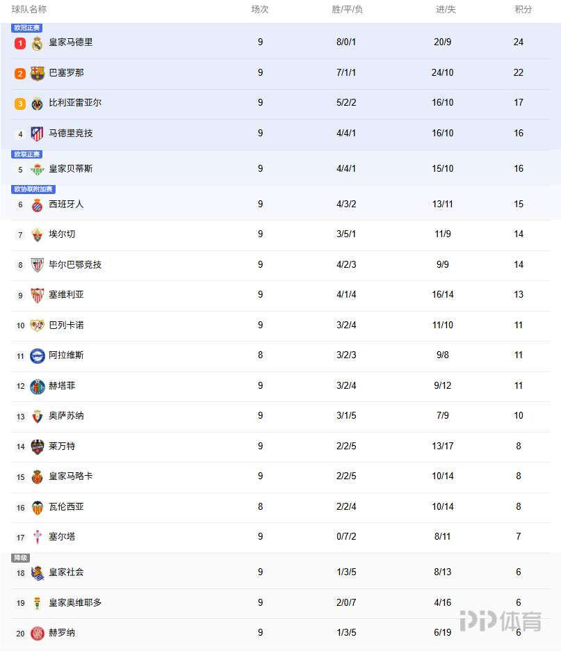 西甲第9轮,皇马客场1-0赫塔菲。本轮西甲已经有9场比赛结束,积分榜的形势随之出现了新的变化。