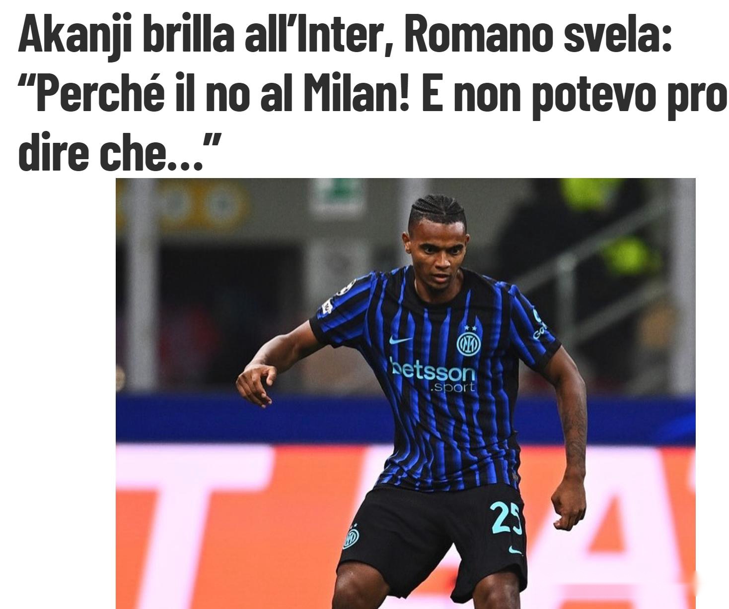 转会专家罗马诺在意媒做节目时指出: 夏季阿坎吉一直被曼城挂牌,引进他最热切的意甲球队一直是AC米兰,但阿坎吉坚决拒绝红黑军,除待遇问题之外,最主要的原因是他非常、非常期待踢欧冠 。