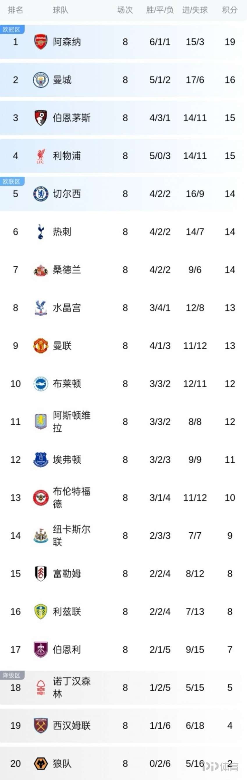 8轮战罢!英超积分榜:阿森纳3分领跑 曼城第2曼联第9