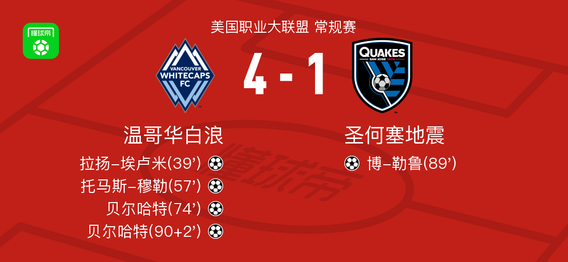 北京时间10月6日美国职业大联盟 常规赛,温哥华白浪主场对阵圣何塞地震。温哥华白浪拉扬-埃卢米破门,托马斯-穆勒破门,贝尔哈特梅开二度。圣何塞地震博-勒鲁破门。最终比分温哥华白浪 4-1 圣何塞地震。