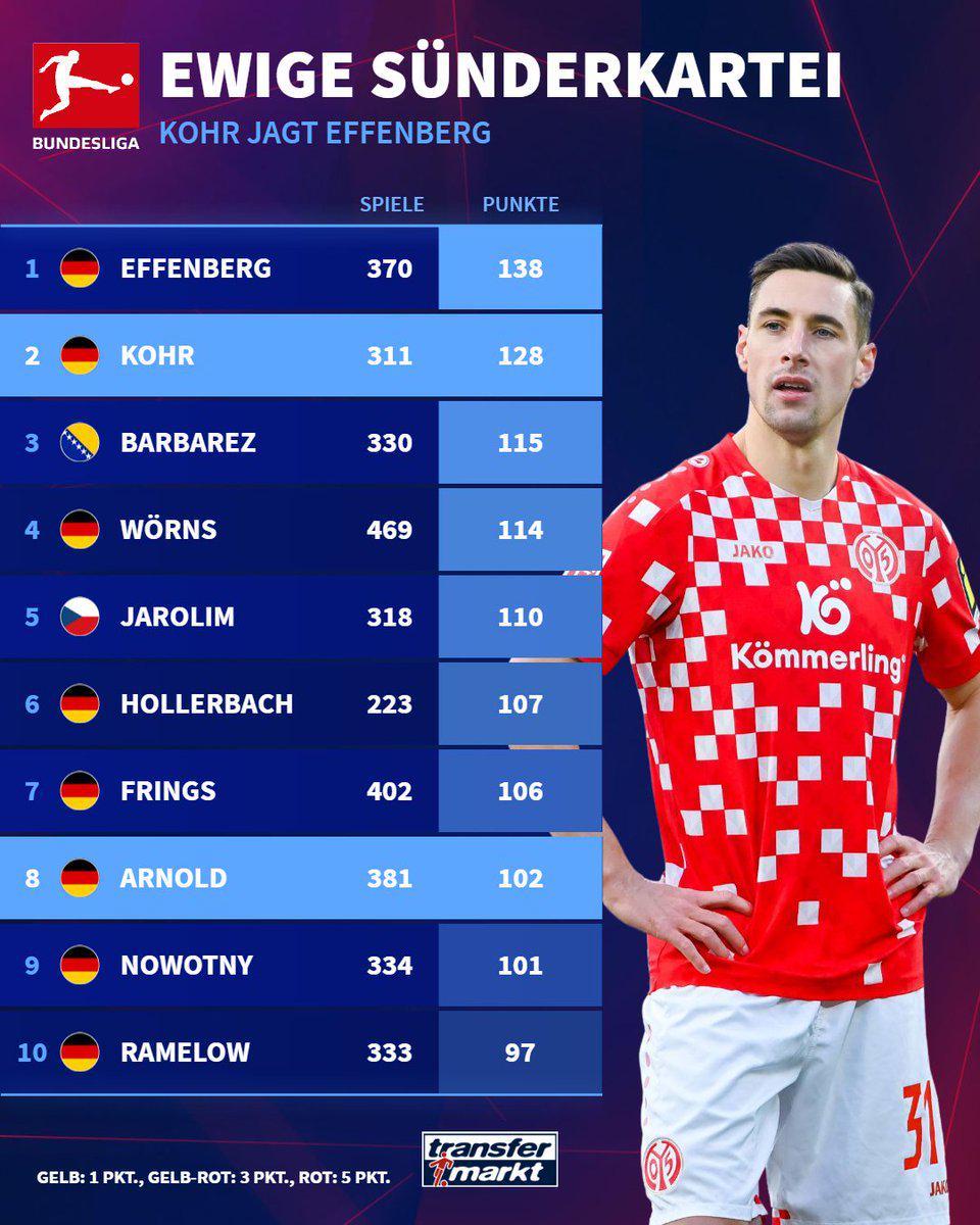 据德甲官方统计,这是科尔德甲生涯第100张黄牌,他也因此成为德甲历史上第二位黄牌数破百的球员。在此之前,唯一达到这一里程碑的还是拜仁传奇“老虎”埃芬博格——这位拜仁名将在370场德甲比赛中累计吃到111张黄牌。