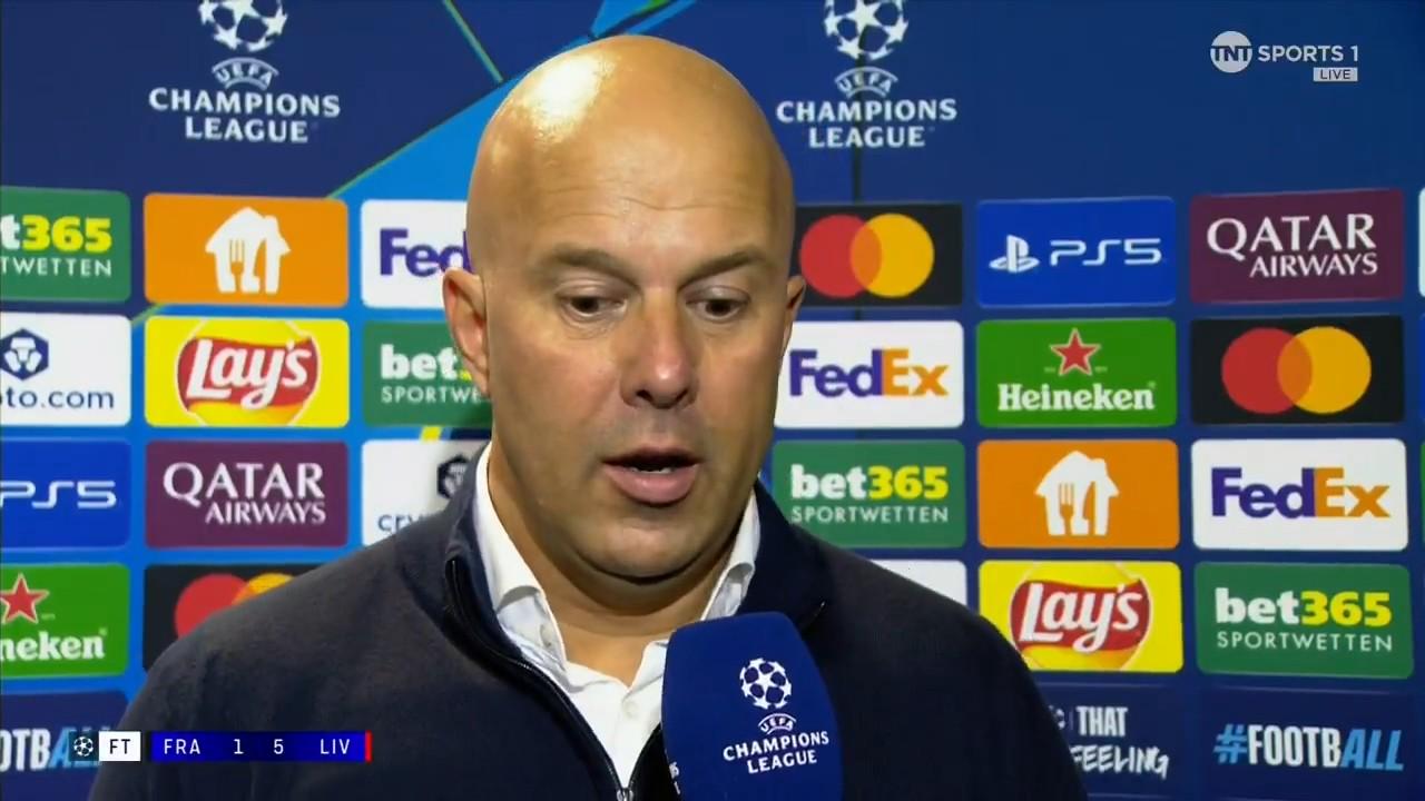 率队在欧冠联赛阶段第3轮客场5-1大胜法兰克福之后,利物浦主教练斯洛特接受了来自TNT体育的采访。