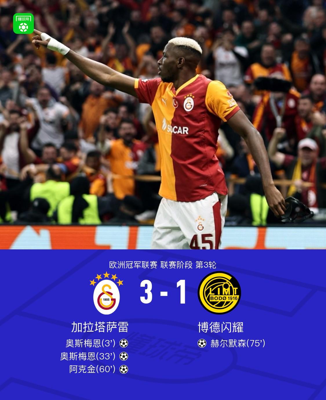 北京时间10月23日,欧洲冠军联赛联赛阶段第3轮,加拉塔萨雷迎战博德闪耀。上半场勒米纳助攻奥斯梅恩闪击,之后布约尔坎乌龙助攻,奥斯梅恩笑纳大礼完成双响。下半场奥斯梅恩抢断后传球,阿克金射门被扑后补射破门,之后赫尔默森头球破门扳回一球。最终加拉塔萨雷3-1战胜博德闪耀。