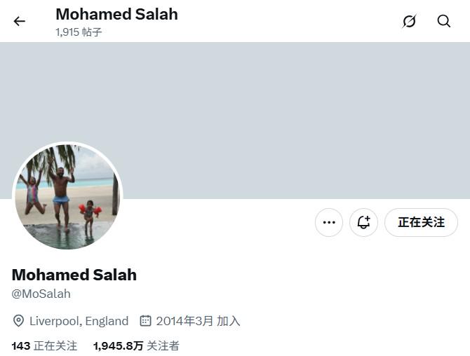 早些时候,萨拉赫更新了社交媒体账号个人资料,将自己身穿利物浦球衣的头像换成了个人家庭生活照。将夺冠庆祝头图换成了纯灰图片。