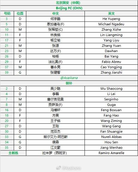 北京国安首发:39-张健智、3-何宇鹏、26-柏杨、5-恩加德乌、37-曹永竞、23-达万、21-张源、10-张稀哲、29-法比奥、11-林良铭、17-杨立瑜