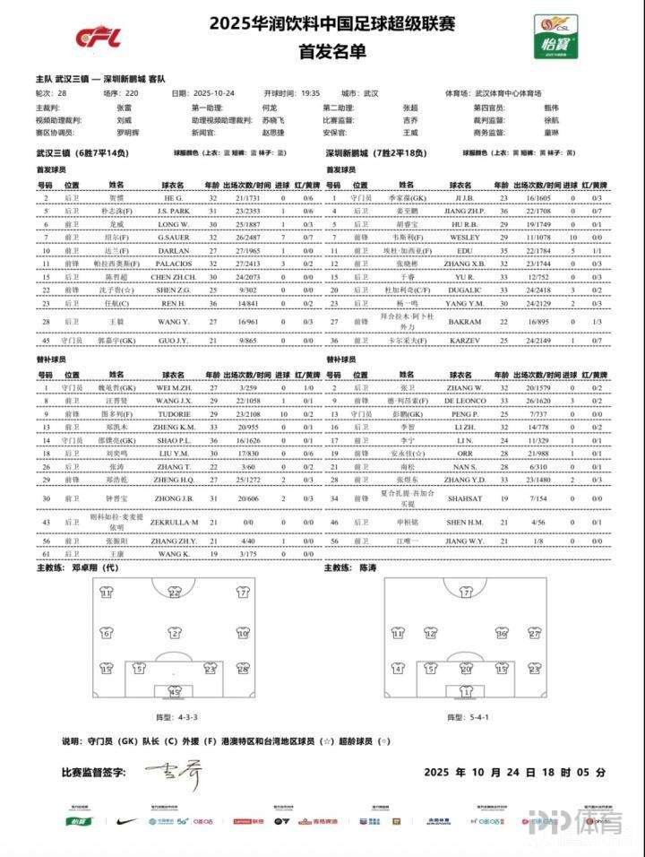 北京时间10月24日19:35,中超第28轮,武汉三镇坐镇主场武汉体育中心体育场迎战深圳新鹏城。本场主裁判张雷,VAR裁判为刘威。双方赛前公布首发名单。