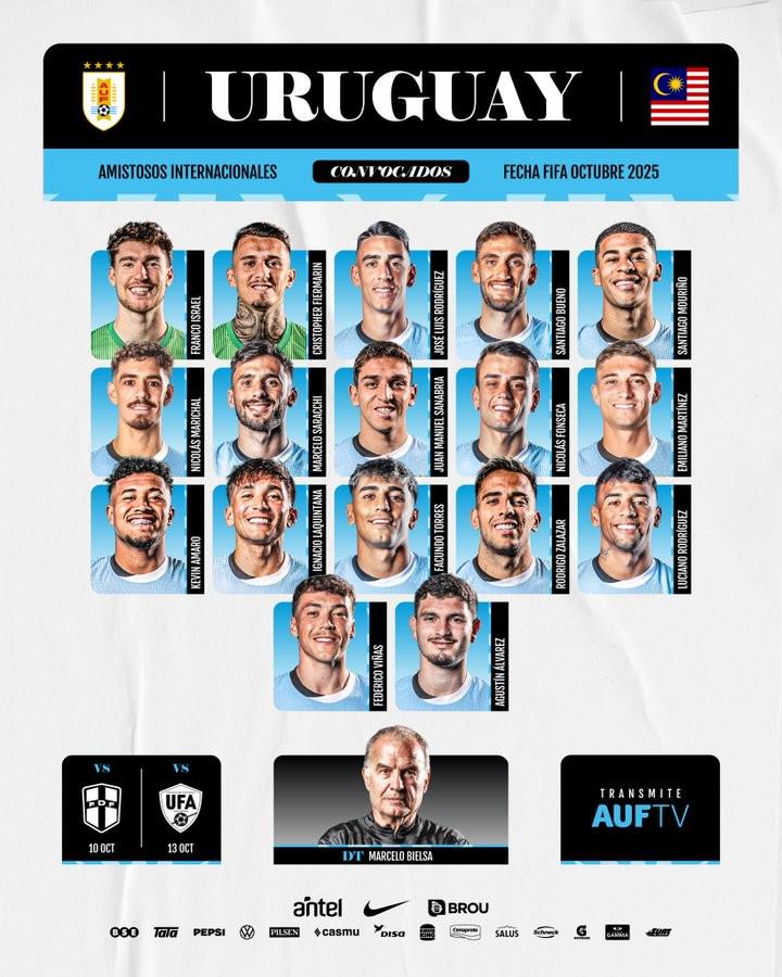 北京时间10月6日,乌拉圭国家队公布了10月两场友谊赛的大名单,贝尔萨仅征召了17名球员,巴尔韦德、阿劳霍、努涅斯等核心球员轮休。