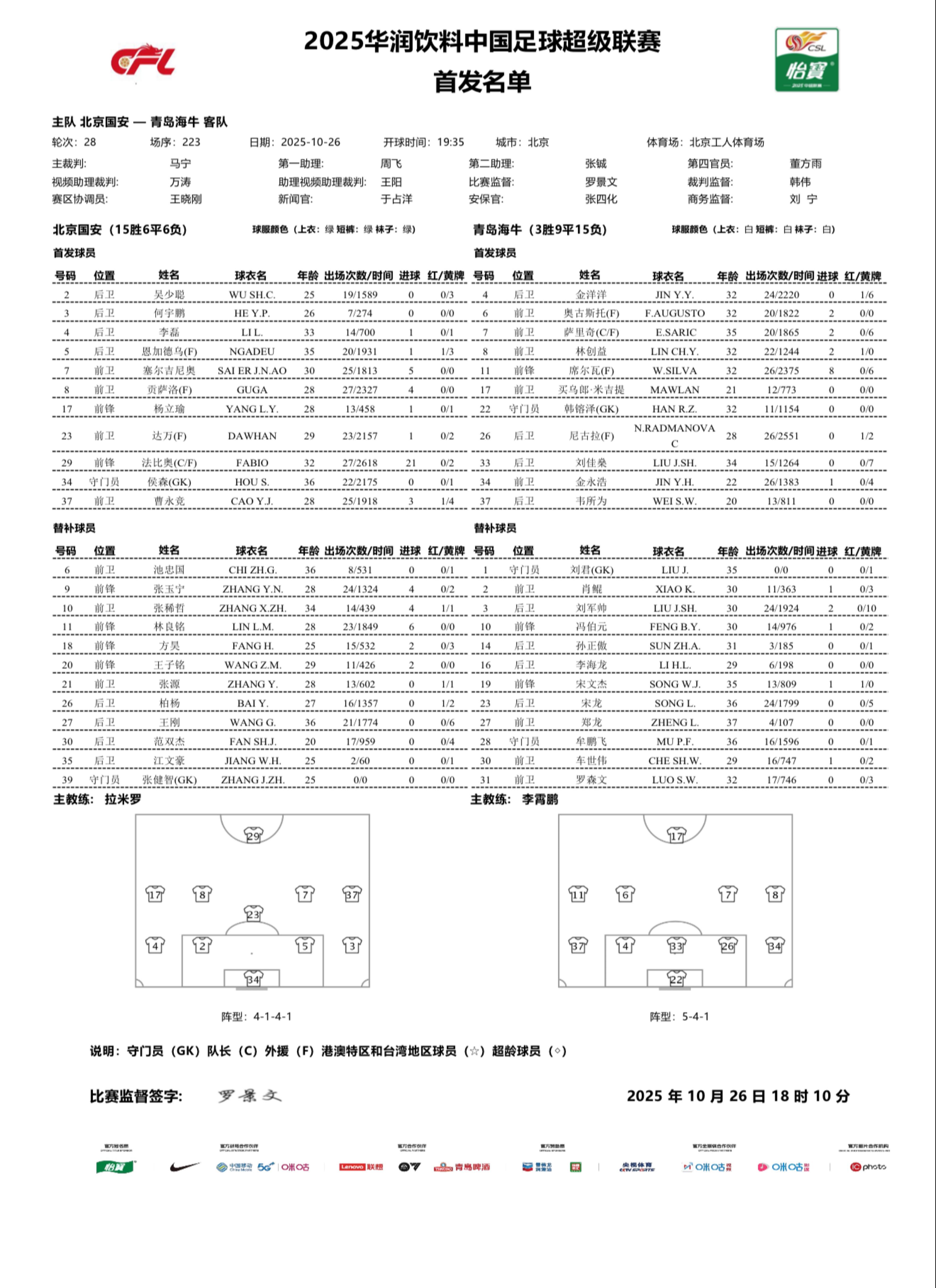 北京时间10月26日晚间19:35,中超联赛第28轮,北京国安坐镇主场北京工人体育场,迎战青岛海牛,本场比赛主裁判为马宁,视频助理裁判为万涛,双方首发名单: